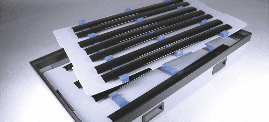 Ein Tray ist eine Verpackungslösung, bestehend aus einer Trägerplatte. Diese wird mit Zahnleisten und/oder Formteilen aus PE-Schaumstoff bestückt.